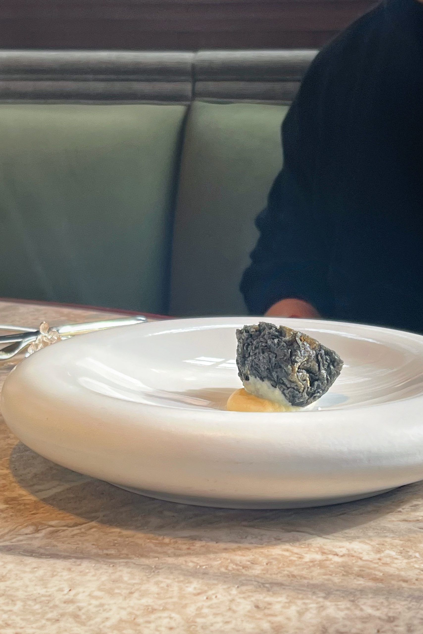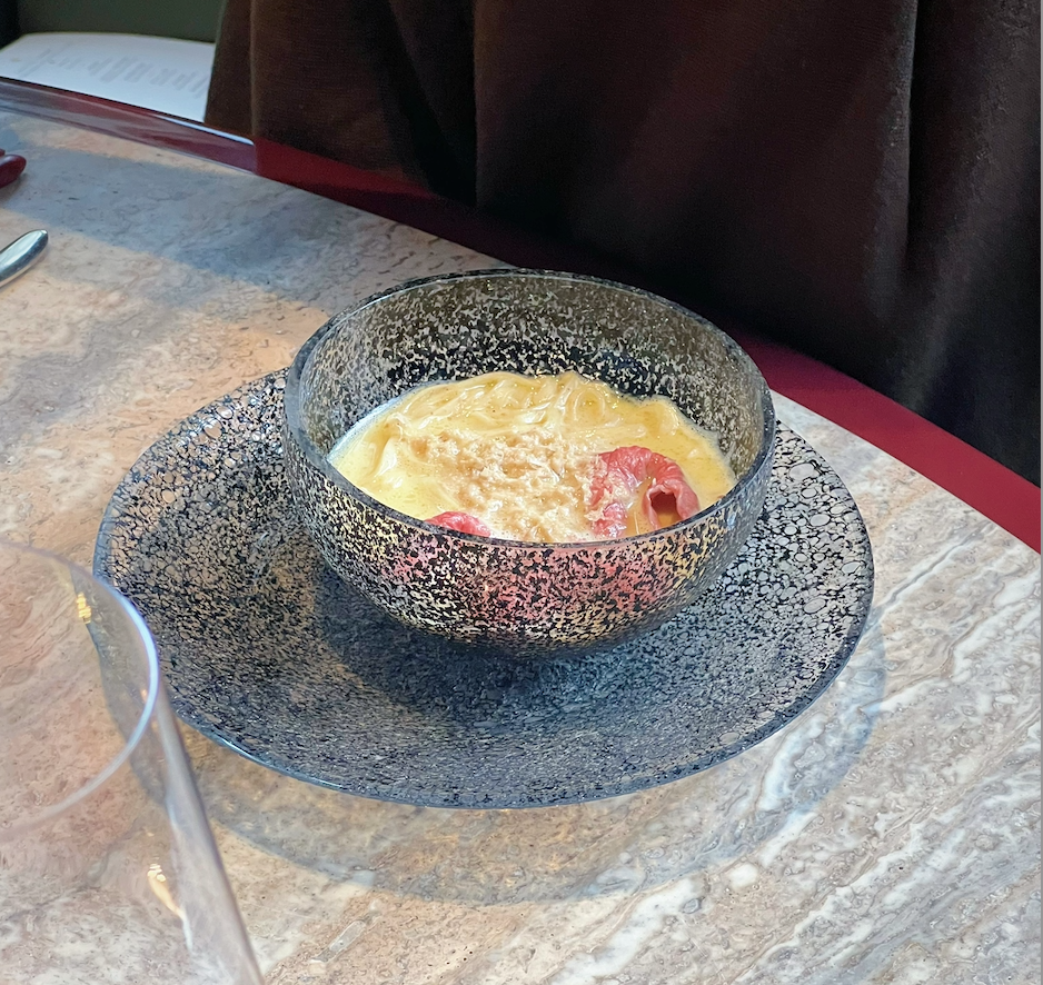 Citrus-filled choux with Nepalese pepper cream offered a brightness and spice, while kampachi tartare with watermelon radish and green apple was clean and refreshing. Chilled abalone contrast tenderness with crisp textures, each ingredient balanced.