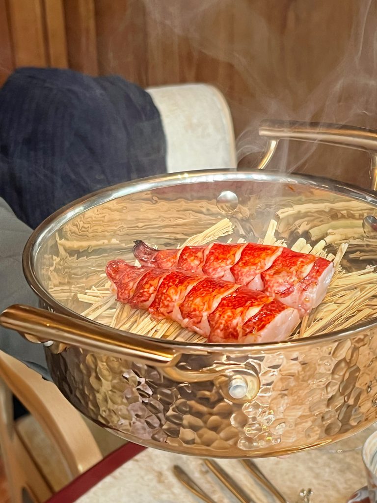 Scallops are air-freighted daily from France. Wrapped in yuba for a crunch, they’re finished with black truffle egg yolk sauce. A whole Brittany blue lobster, hay-smoked and simmered with orzo, married richness and elegance, its roe sauce coating each grain.