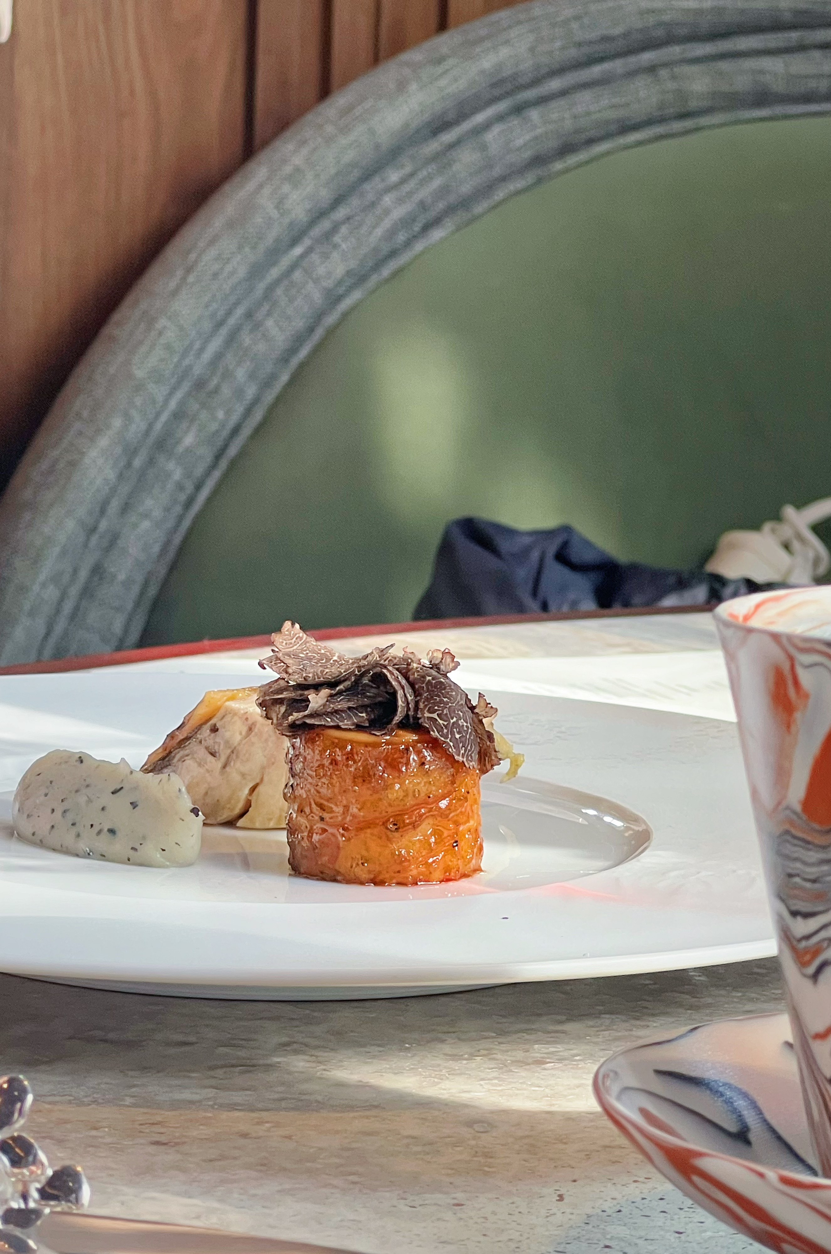Charcoal-grilled Shaoxing capon covered with chicken ball, was served with fresh truffle, and Jerusalem artichoke purée – a blend of Chinese ingredients and French technique.
