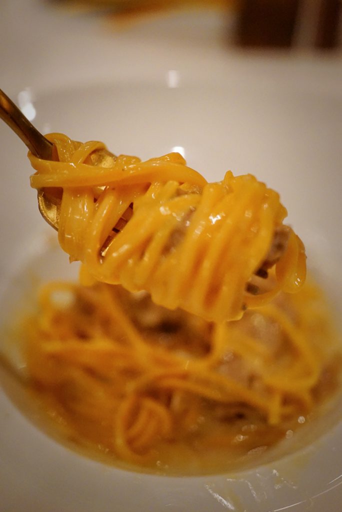 Even beyond peak season, the restaurant secured white truffles of exceptional quality. Handmade pasta, butter, veal jus, 36-month Parmigiano Reggiano, and freshly shaved white truffle, simple and purity.