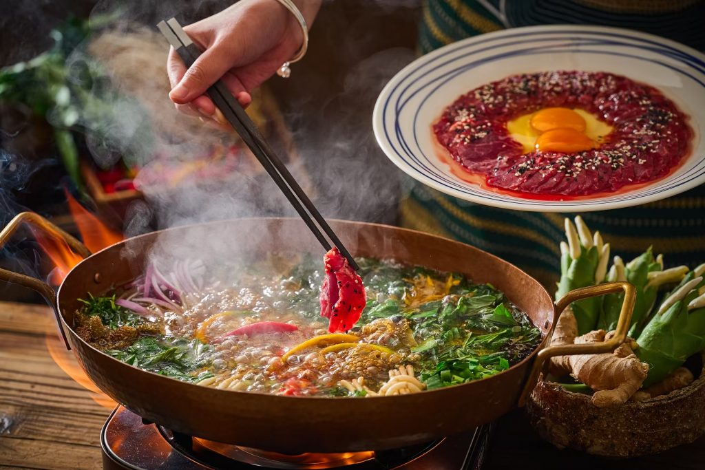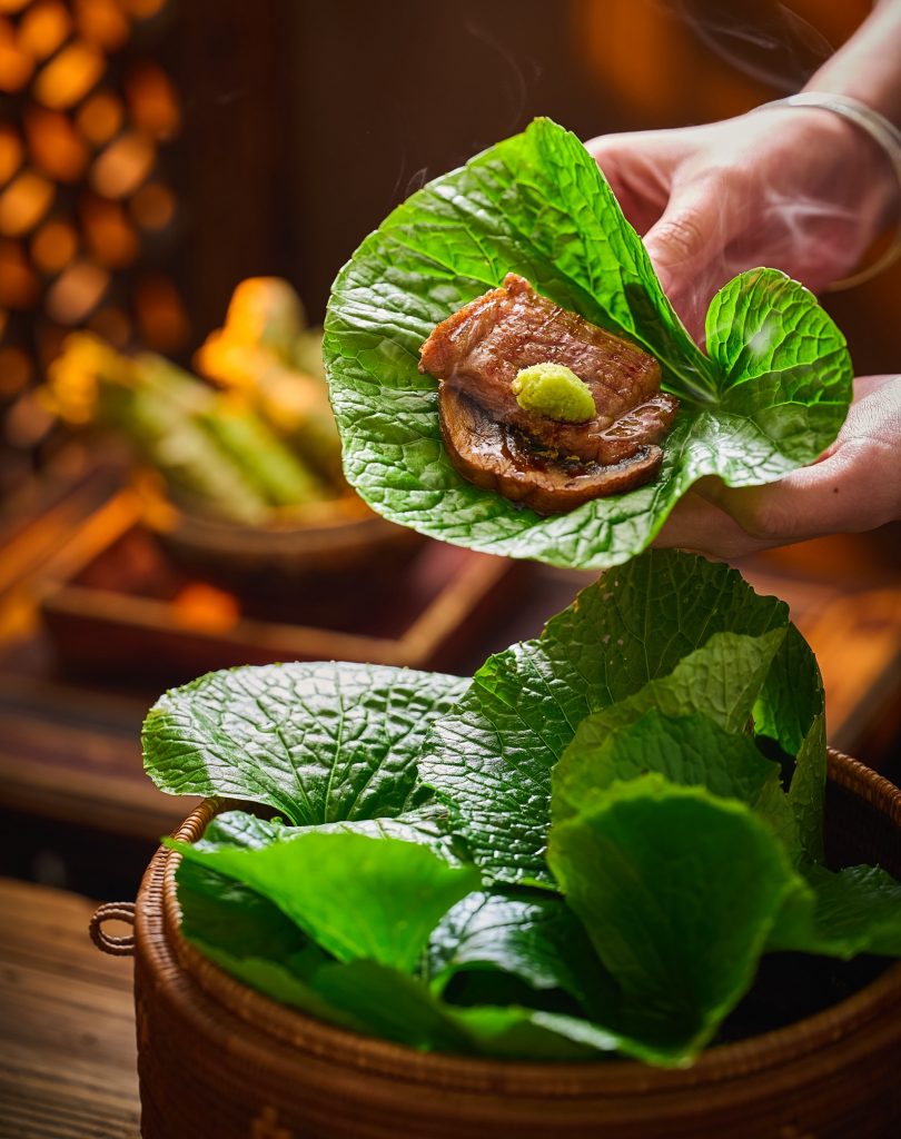 The flavors in the Simao region are built on fragrance. Onion, ginger, and garlic simmer slowly with cardamom, star anise, and fennel in rapeseed oil, enriched with a light beef broth made from carrots, celery, fennel bulbs, and bones. Fresh herbs and spices such as cilantro, fish mint, basil, mint, litsea, and lemongrass layer in one by one. Paper-thin slices of Xianglong meat dip into boiling oil, cooking in just eight seconds. Fresh, tender, and lingering in flavor, each bite is intense and refreshing.