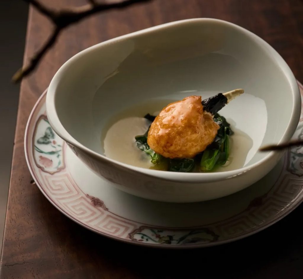 Equally imaginative is the oil-poached snow crab. Known for its delicate flavor, it is briefly poached in oil infused with shrimp shells, ginger, scallion, and garlic for about a minute. Luminous and silky, the crab is rich yet never greasy, subtle but layered – an illustration of Cantonese lightness that lingers on the palate.