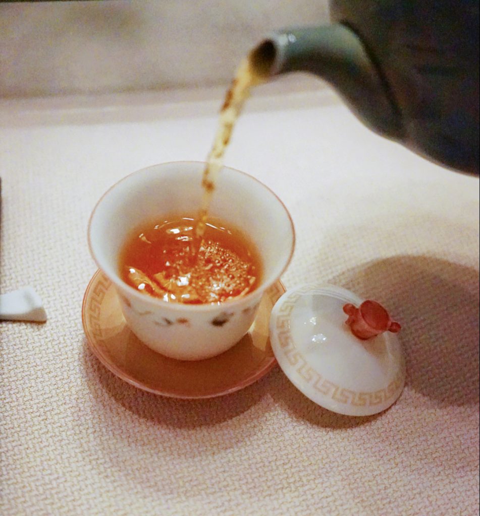 At House 102, each banquet is accompanied by whole-leaf teas selected to complement. The crab feast opens with a 24-hour cold-brewed Yunnan white tea from ancient trees, offering a sweet-refreshing start. Later, Shui Xian oolong tea from Wuyi mountain – with soft orchid notes – is paired with the stuffed crab claw, where floral aroma and crab sweetness intertwine.