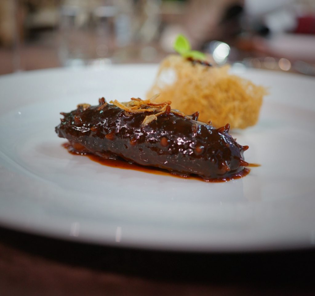 Equally revealing was a dish of shrimp-stuffed, braised sea cucumber served with crispy taro puff pastry. Each component is regionally iconic, yet together they formed a whole. Finely chopped shrimps stuffed into gently braised Liaoning sea cucumber delivered layered sweetness and a clean, oceanic depth – proof that Cantonese cuisine can absorb new influences without losing its identity.